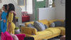 Curvy woman in bright colored printed romper with yellow heelsPrinted colorful romper with cross detail, up close view
